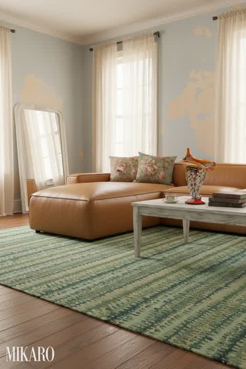 Shabby Chic Living Room: Caramel Leather Chaise & Cozy Rug Design Idea