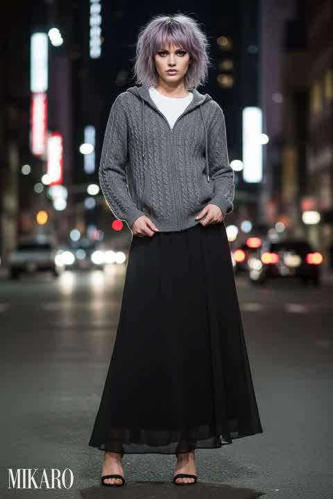 The metallic pants paired with the leather jacket create a striking, futuristic yet gritty aesthetic. The contrast of textures and the bold styling are very effective.