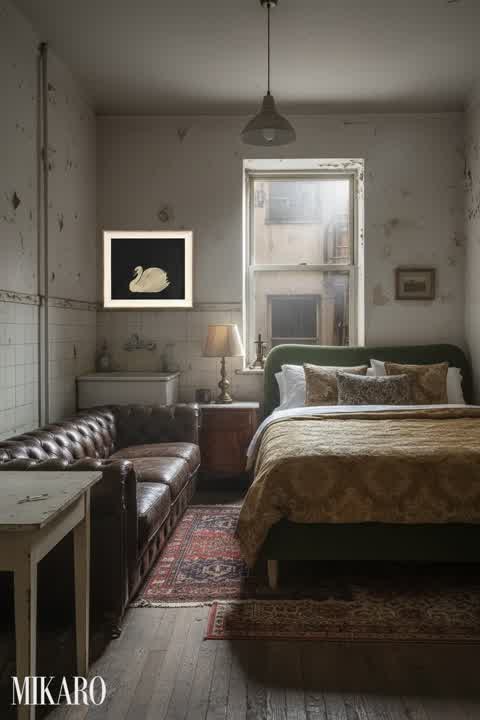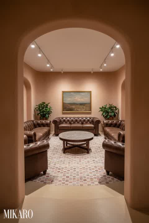 The generated image successfully captures the traditional alcove setting with a heritage shell. The furniture pieces are well-integrated, though the blue chairs feel a bit modern against the very classic background, creating a slight stylistic tension. However, the volumetric lighting and high-end textures are beautifully rendered, making for a visually rich scene despite the minor stylistic clash.