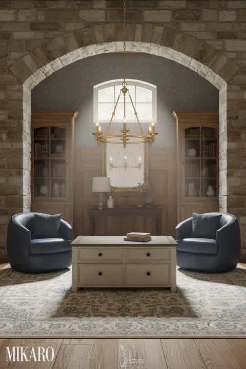 The juxtaposition of a traditional bedroom with a cramped city kitchen setting is certainly an experimental creation. The rich textures and specific furniture pieces, particularly the chesterfield sofa and velvet bed, maintain their luxurious feel. However, the overall composition, while unique, feels somewhat forced due to the challenging room description, making it more of an eclectic curiosity than a harmonious design. It's a bold attempt, but the elements clash rather than blend.