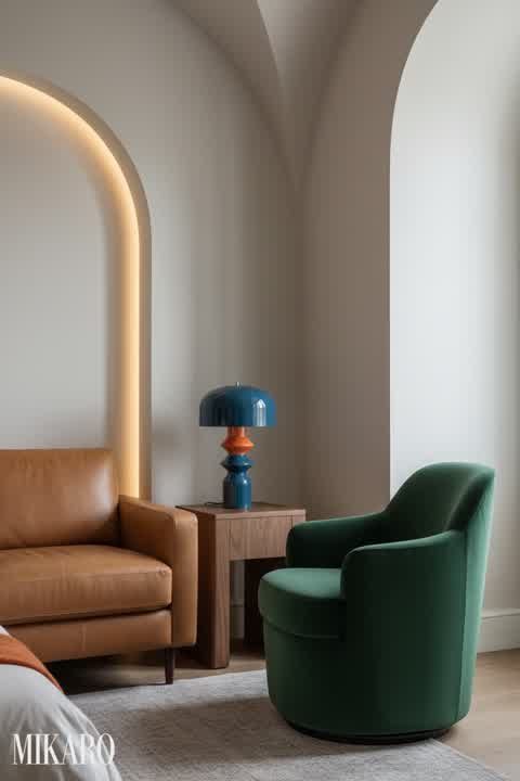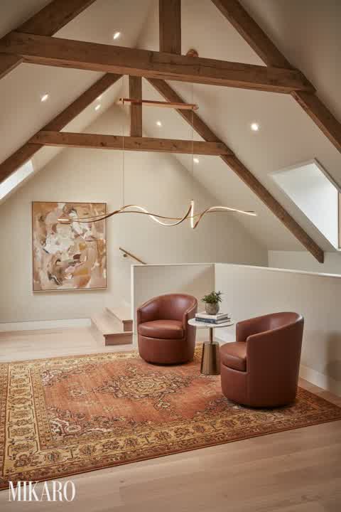 The created image successfully captures a transitional hallway with a sense of calm and openness. The combination of the warm wood tones and the cool blues of the rug works well, and the minimalist lighting enhances the gallery feel. However, the sculptural wall art and the striped rug, while individually striking, could be seen as slightly competing for attention rather than harmonizing seamlessly in this particular composition, potentially making the space feel a little less cohesive than intended.