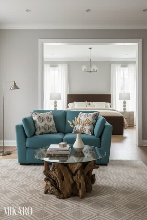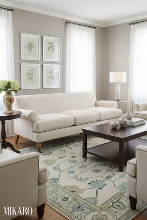 The Transitional style effectively balances modern minimalist lines with classic comfort elements. The curved velvet sofa introduces a soft, inviting aesthetic, while the clean lines of the coffee table and the structured ceramic lamps add a contemporary edge. The neutral color palette ensures timeless appeal and versatility, allowing for easy integration of diverse decor pieces. This blend creates a sophisticated yet livable space that feels both current and enduring.