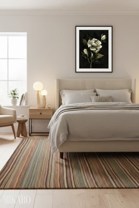 The Transitional style truly shines here, successfully bridging traditional warmth with contemporary clean lines. The Handmade Colorful Roses Floral Wool Area Rug introduces a vital layer of color and organic texture, grounding the space with a touch of classic botanical charm without overwhelming the modern sensibility. The WILLIAMSPACE 36" Oval Coffee Table, with its faux stone finish and sculptural form, acts as a subtle anchor, bringing a natural element and sleek design that complements both the rug's softness and the art's modern edge. Finally, the Art Remedy Boho Abstracts Canvas 'Golden Orb II' provides a sophisticated focal point, its muted gold and abstract circular motif harmonizing with the neutral tones of the table and the subtle curves of the rug's floral elements. This thoughtful curation creates a cohesive, inviting, and visually interesting space that feels both current and enduring.