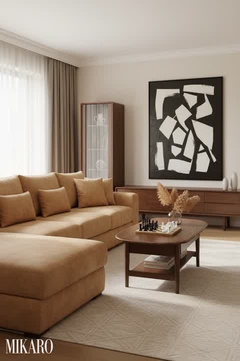 The composition aims to blend the rustic charm of the modern farmhouse coffee table with the vibrant, feminine appeal of the floral rug and artwork. While the individual pieces are strong, the integration of the very distinct modern farmhouse coffee table with the overtly romantic floral rug presents a bit of a challenge. The coffee table's clean lines and natural wood are quite different from the soft, colorful, and organic shapes of the rug. The artwork, with its prominent floral dress, complements the rug well, but the overall feeling might be slightly disjointed for a truly cohesive Transitional look. A more refined coffee table or a rug with a subtler pattern might create a more harmonious flow. However, for those seeking a bold contrast and a playful, maximalist approach within a Transitional framework, this combination could be quite appealing.