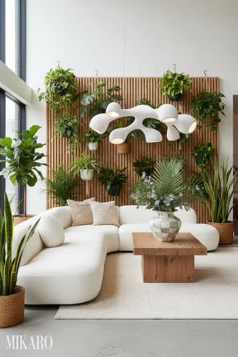 The Urban Jungle style thrives on the juxtaposition of lush greenery with refined furnishings. The organic textures of the rug and the rich wood tones of the coffee table provide a grounded base, while the modern glass lamp introduces a sleek, sophisticated contrast. Strategic plant placement enhances the natural, calming atmosphere, making the space feel both vibrant and chic. This combination works because it balances the raw beauty of nature with intentional design, creating an inviting and visually stimulating environment.