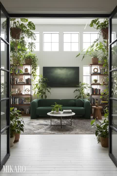 Urban Jungle: Lush Green Retreat with Mid-Century Modern Sofa