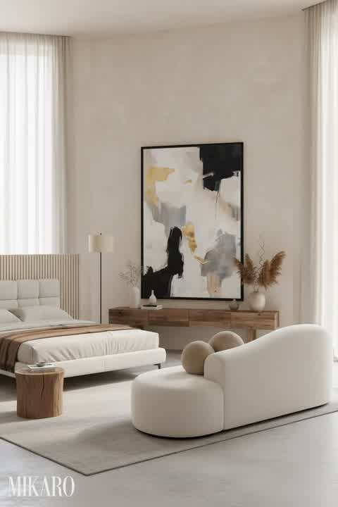 Integrating a traditional, tufted mahogany bed and a mid-century modern chandelier into a Wabi-Sabi aesthetic was an interesting challenge. The ornate nature of the bed's headboard and the chandelier's sleek, almost space-age design could easily clash with Wabi-Sabi's raw, imperfect ethos. However, by softening the overall palette with muted plaster walls, natural textures, and a deliberate sparse arrangement, the more formal pieces are anchored. The deep olive velvet sofa, while plush, works surprisingly well due to its earthy tone and simple form, providing a grounding element. The contrast creates a unique form of 'imperfect elegance' rather than pure Wabi-Sabi, leaning more into a rustic-modern luxury with Wabi-Sabi undertones. It might not be a 'pure' Wabi-Sabi composition, but it offers a sophisticated blend for someone seeking tranquility with a touch of curated opulence.