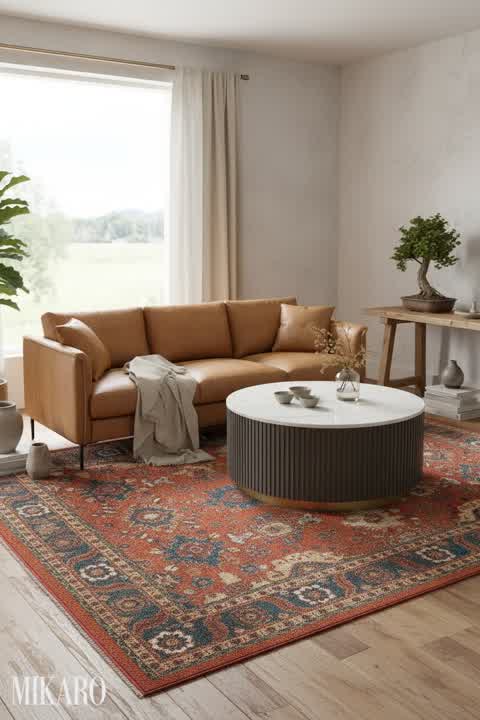 The juxtaposition of the sleek, modern gold coffee table with the organic textures and muted tones of the Wabi-Sabi aesthetic creates a dynamic yet balanced space. The floral art piece and the patterned marble vase subtly introduce intricate details, preventing the room from feeling too sparse, while still honoring the style's emphasis on natural beauty and imperfection.