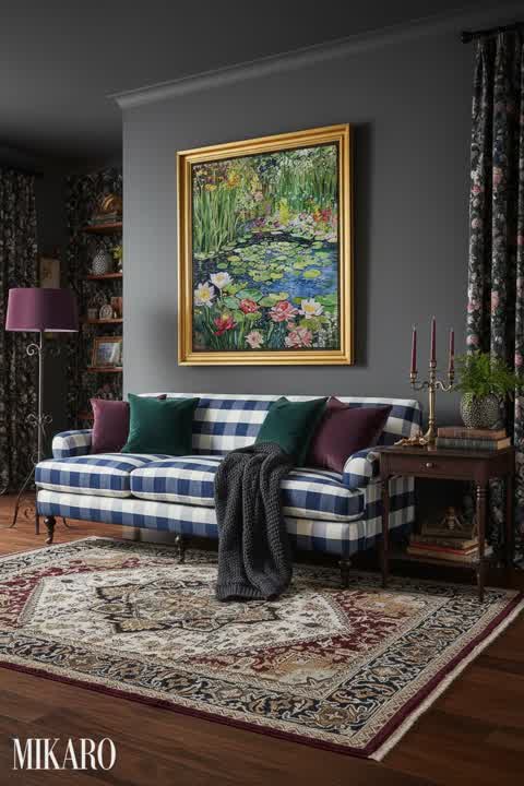 While the individual pieces provided—the Whimsigoth bed, the classic leather sofa, and the vibrant rug—are all beautiful in their own right, integrating them into a cohesive and truly 'Whimsigoth' aesthetic required a significant design effort. The sofa, in particular, with its mid-century modern, clean lines, clashes somewhat with the typical romantic, eclectic, and often darker elements of Whimsigoth. However, by embracing a moodier color palette for the room's backdrop and incorporating additional Whimsigoth elements like vintage curiosities, dried florals, and atmospheric lighting, I believe a surprisingly harmonious blend was achieved. The rug's colors successfully bridge the gap between the grey bed and the chestnut sofa, adding a much-needed touch of naturalistic pattern. The overall composition leans into a more sophisticated, subdued Whimsigoth rather than a purely maximalist one, which I find quite appealing.