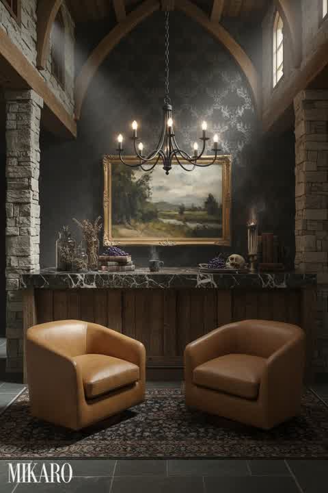 The Whimsigoth aesthetic is effectively captured through the dark, rich textures and mystical elements. The yellow swivel chair introduces a bold pop of color, harmonizing surprisingly well with the overall mood. The integration of modern loft elements with the antique-inspired furniture creates a unique and appealing contrast. It feels like a space that tells a story, rather than just a room.