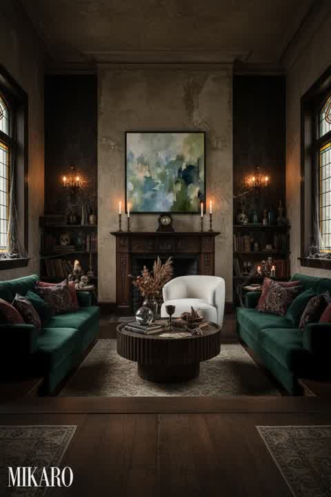 The Whimsigoth style in this composition creates a unique and intriguing reading nook. The deep greens and rich browns blend well with the dramatic lighting, though the traditional rug, while visually striking, could have been more seamlessly integrated into the specific Whimsigoth aesthetic for a truly cohesive look. It works, but it feels like two distinct styles are having a friendly conversation.